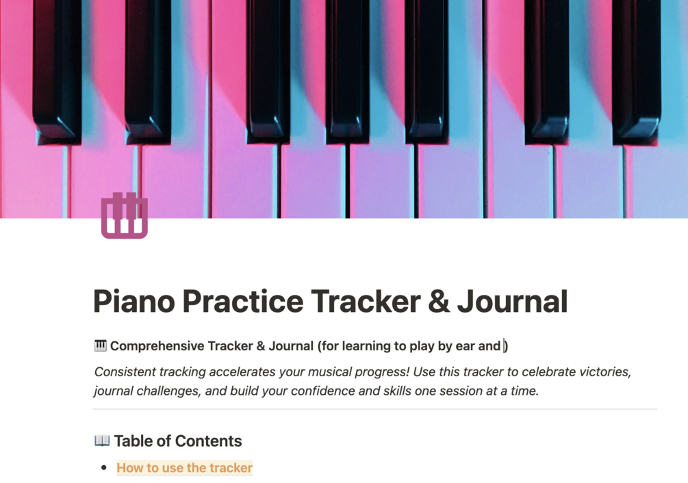 Ditch the guesswork. Log your progress. Actually get better. This Notion-powered piano tracker keeps you focused, motivated, and making real noise (the good kind). Great for beginners, perfect for habit-builders.